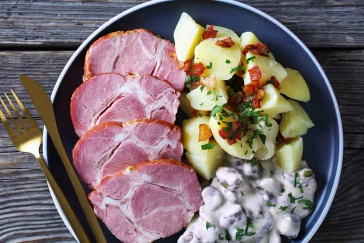 Or pork spine with beans. The people of Luxembourg are very fond of pork and love to have various smoked meat dishes for lunch and dinner. The pork backbone for this dish is smoked and served with beans, turnips and radishes. It is a very hearty and quite fatty dish.